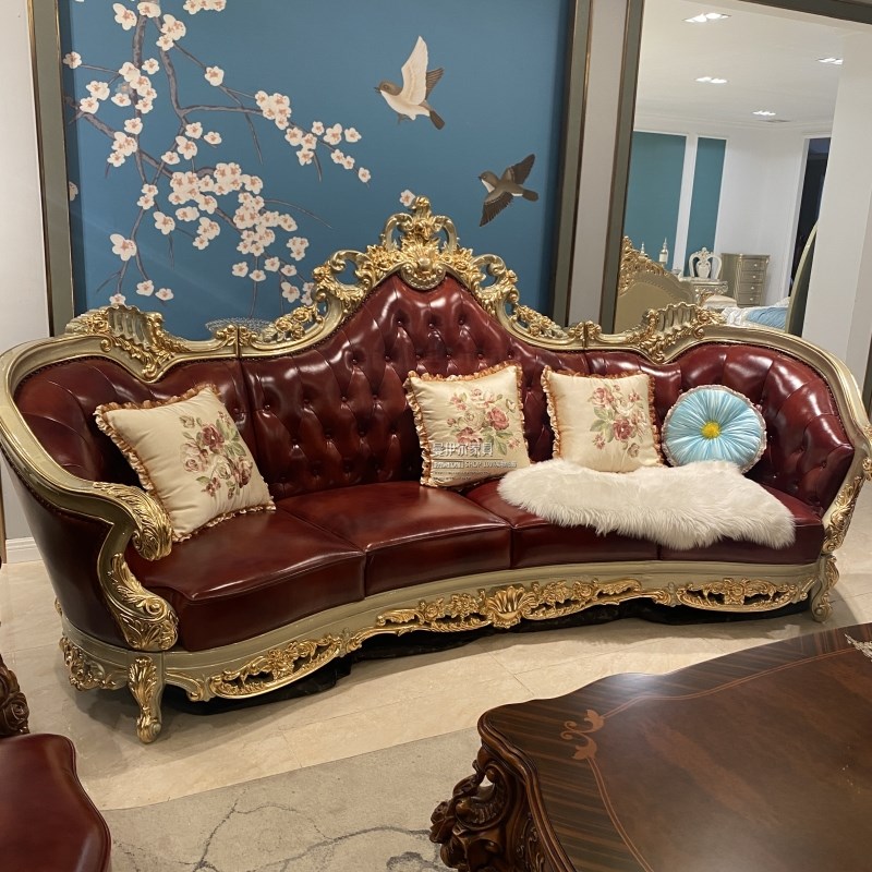 欧式真皮沙发奢华客厅实木雕刻家具高档H别墅头层牛皮金箔型香槟
