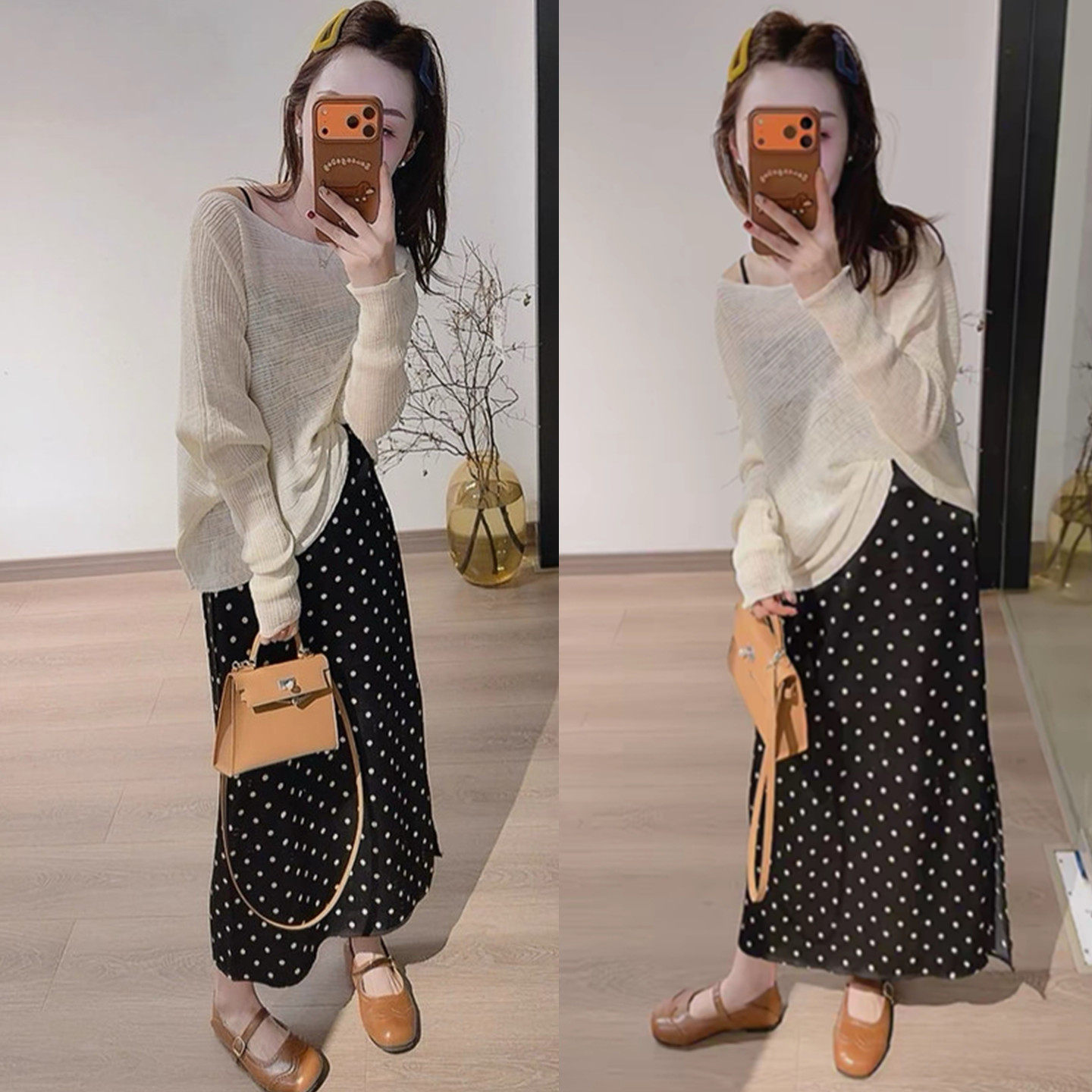 巨好看早春穿搭气质韩系时尚露肩针织罩衫上衣波点半身裙两件套女