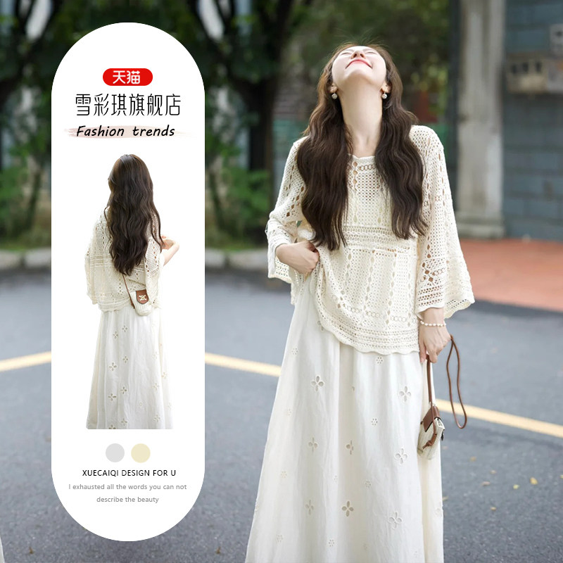 春夏新款女装镂空针织罩衫薄款蝙蝠衫背心连衣裙显瘦洋气两件套裙
