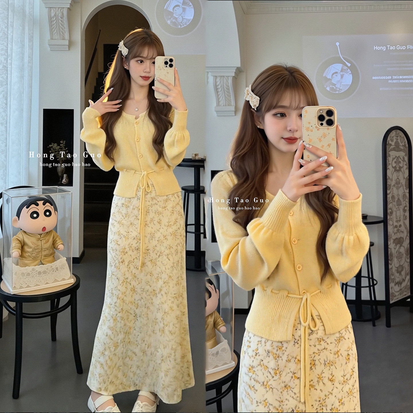 早春穿搭一整套小香风黄色针织开衫半身裙巨好看绝美漂亮两件套女