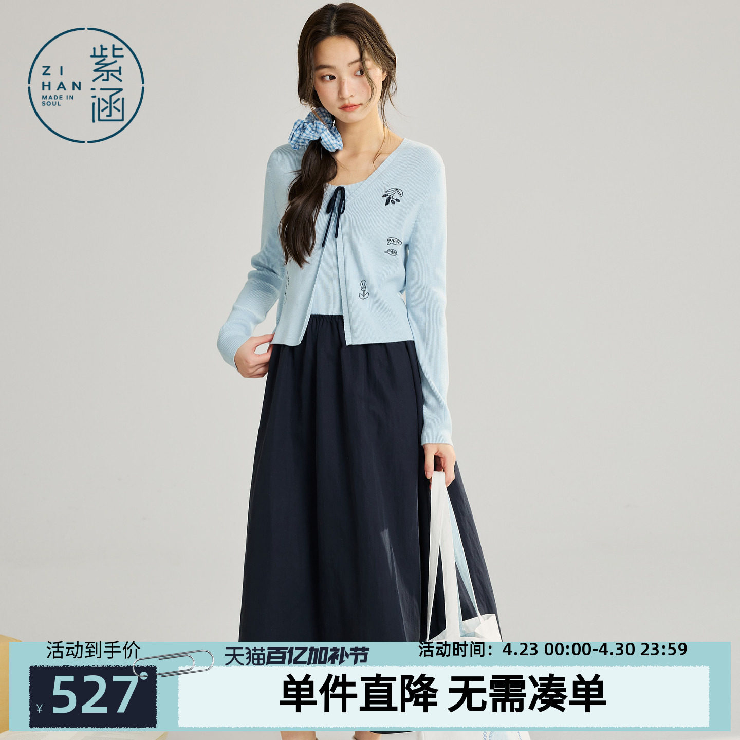 紫涵桑蚕丝v领针织开衫吊带拼接连衣裙两件套装女2026年春季新款