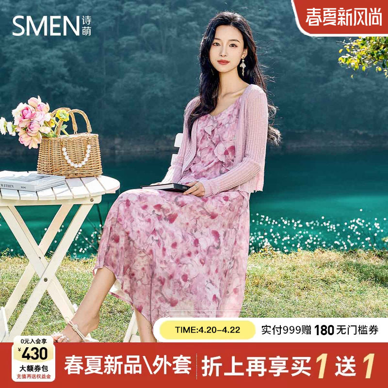 Smen诗萌粉色吊带裙碎花连衣裙针织开衫两件套2026夏季新款法式