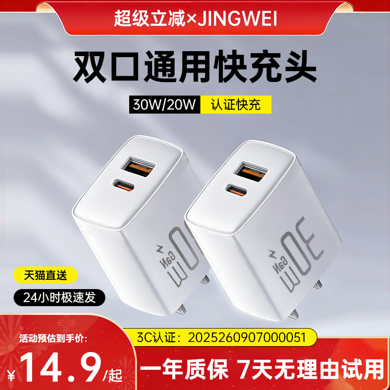 【国家3C认证】京纬30w充电器双口快充usb插头typec适用华为p60pro小米安卓手机充电头耳机台灯充电器线套装