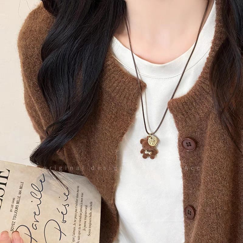 可爱咖色毛绒小熊吊坠项链秋冬长款卫衣2026新款百搭毛衣挂件配饰