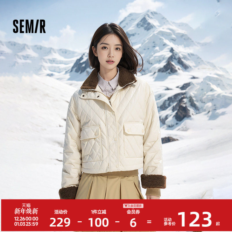 森马外套女中长款菱格仿羊羔毛宽松冬2024新款撞色夹棉夹克两面穿