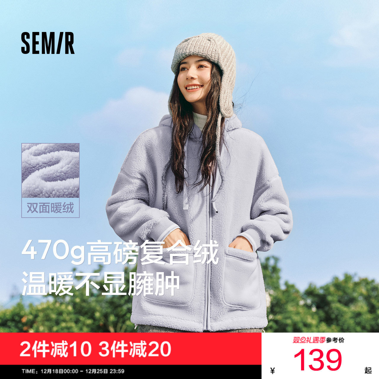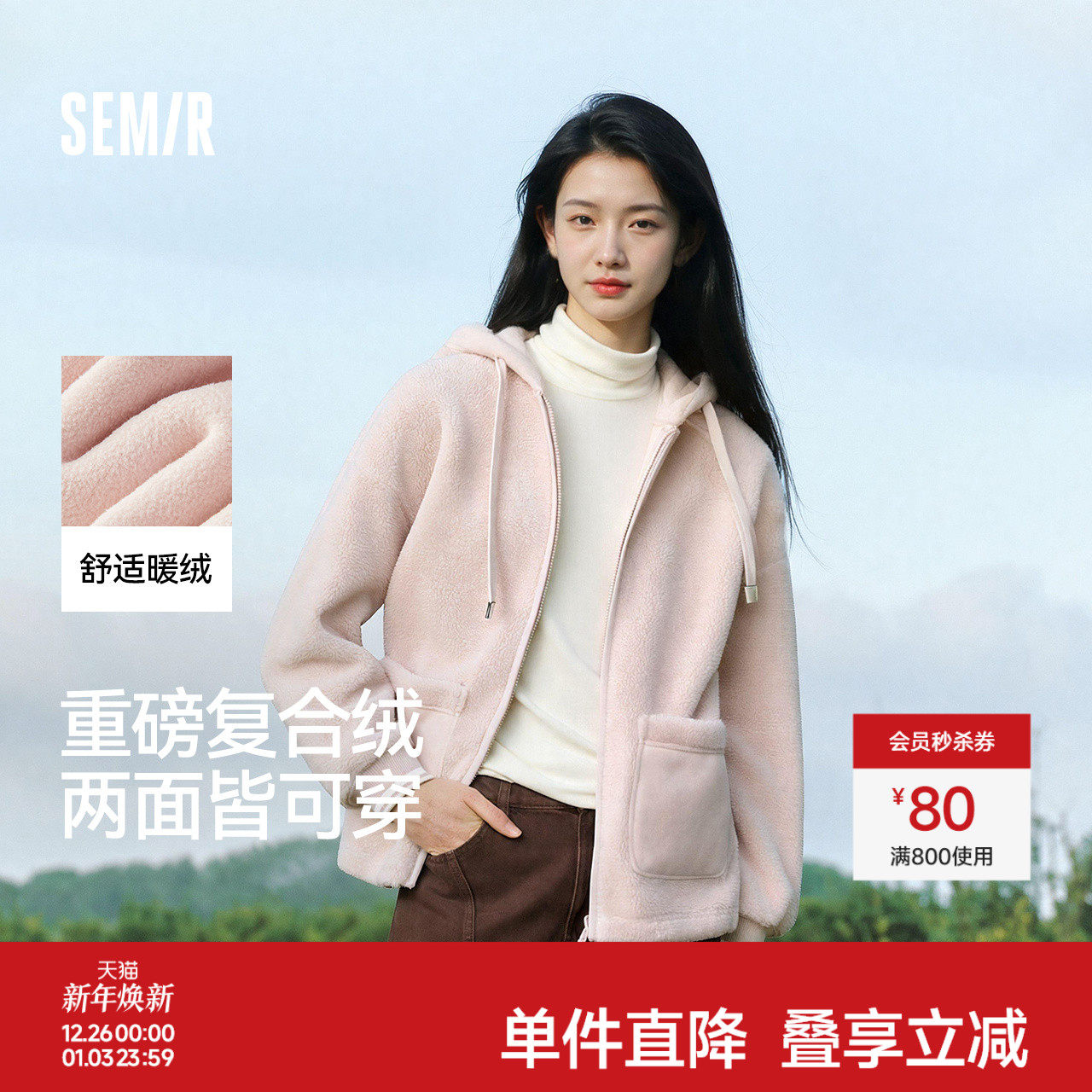 森马外套女仿羊羔毛摇粒绒双面穿2025冬季新款连帽夹克小个子加绒
