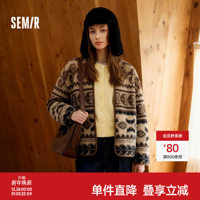 森马外套女冬季仿羊羔毛摇粒绒上衣宽松图案2025新款时尚复古夹克