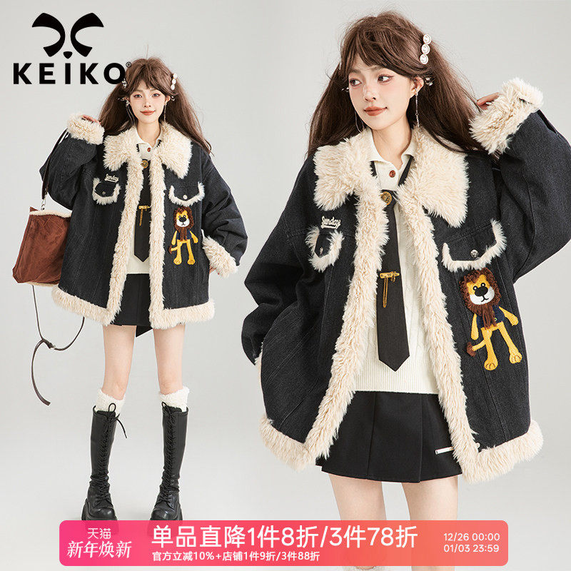 KEIKO [夹棉] 羊羔毛拼接翻领牛仔外套女25冬季卡通绣花宽松夹克