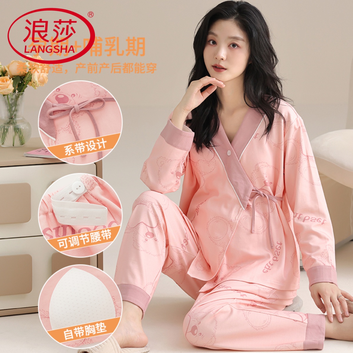 浪莎带胸垫孕妇睡衣春秋季纯棉长袖开衫怀孕期产后哺乳月子服套装