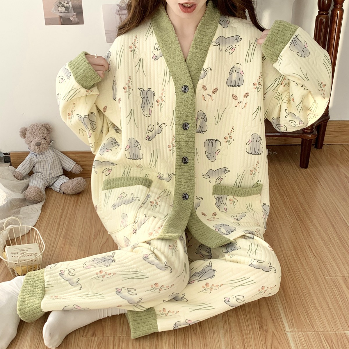 空气棉睡衣女秋冬新款长袖开衫宽松夹棉加厚保暖家居服月子服套装