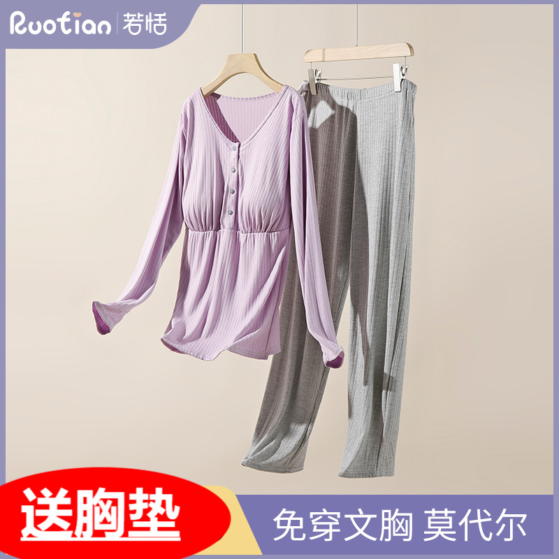 带胸垫孕妇睡衣女春秋季纯棉月子服套装产后哺乳喂奶待产服家居服