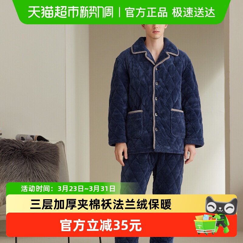 芬腾冬季男士睡衣珊瑚绒夹棉袄三层加厚加绒保暖法兰绒家居服套装