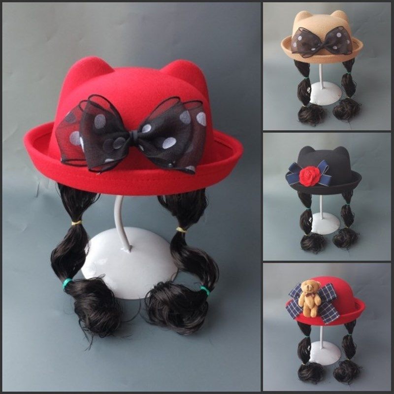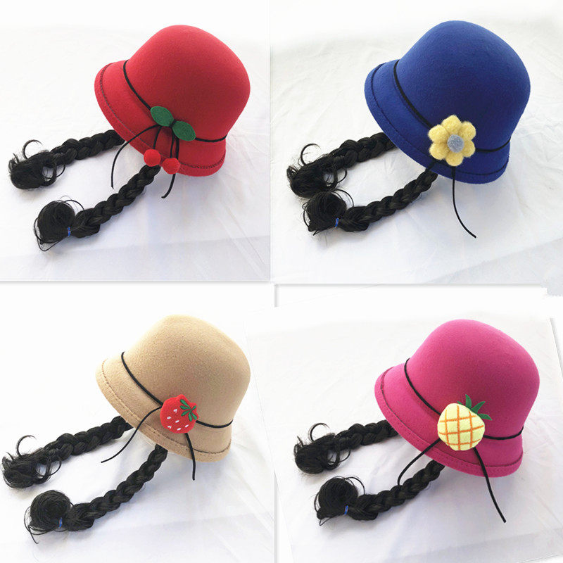 春秋冬季儿童帽子1-3-5-9岁女童假发辫子小礼帽女宝宝毛呢公主帽