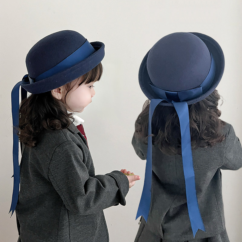 儿童帽子女童日系小圆顶帽蝴蝶结飘带帽学院风幼稚园儿童毛呢礼帽