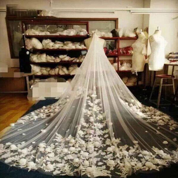 头纱新娘结婚主婚纱奢华超长拖尾蕾丝花边婚礼头饰3D花朵森系拍照