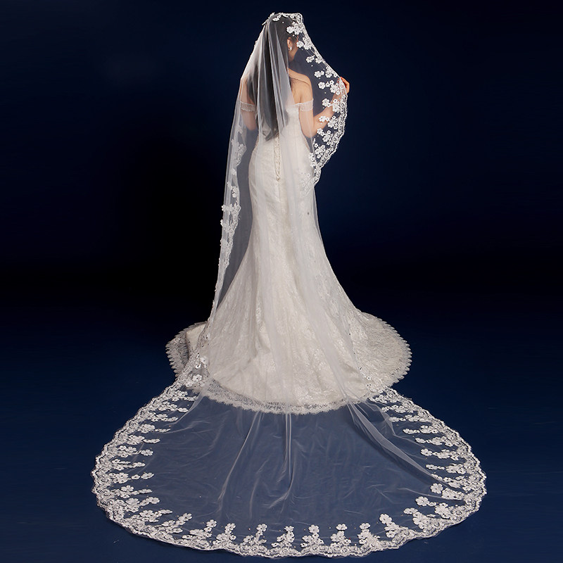 新款韩式浪漫蕾丝长拖尾镶嵌水钻软纱头纱3.8米超长新娘结婚头纱