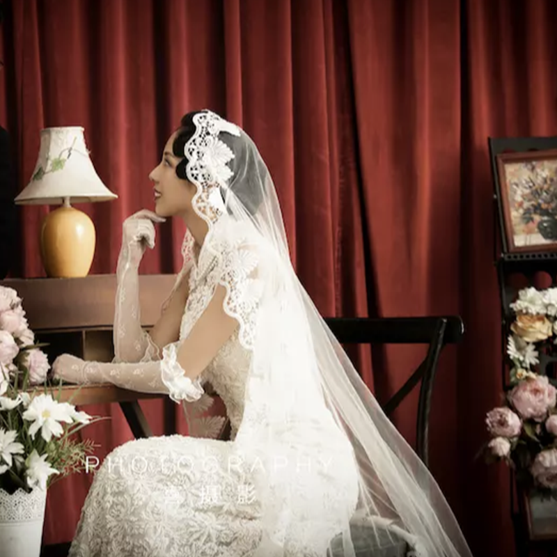 轻奢重工超长拖尾新娘结婚复古蕾丝头纱跟妆造型影楼拍照写真道具