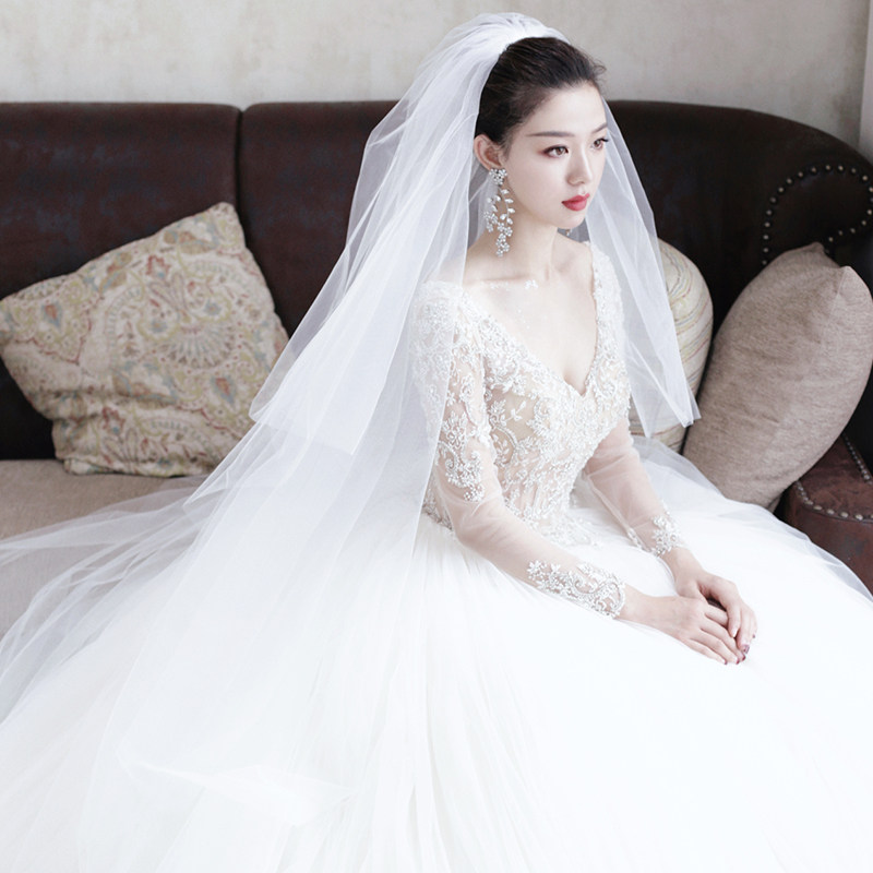 新款新娘超长4米拖尾大头纱韩式结婚礼堂头纱头饰超仙双层遮面纱