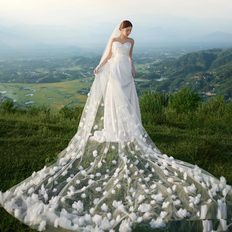 外景婚纱摄影旅拍道具新娘拖尾造型头纱DIY手工白色花瓣超长头纱