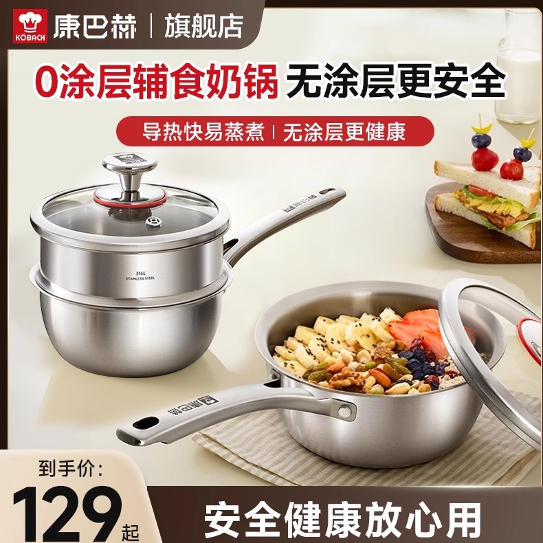 康巴赫食品级316L不锈钢奶锅不粘锅辅食电磁炉通用汤锅家用泡面锅