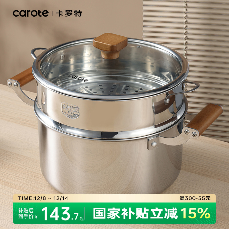 卡罗特蒸锅家用316L不锈钢煮锅汤锅木柄炖锅无涂层燃气电磁炉通用