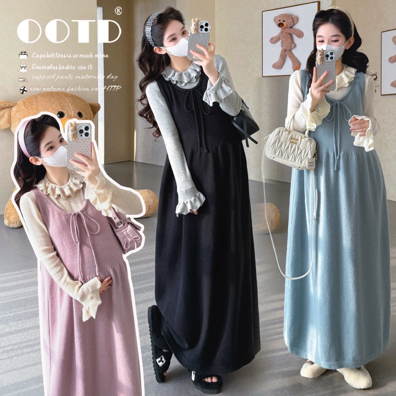2025法式气质孕妇连衣裙木耳边上衣+韩版毛呢孕妇背心裙套装两件