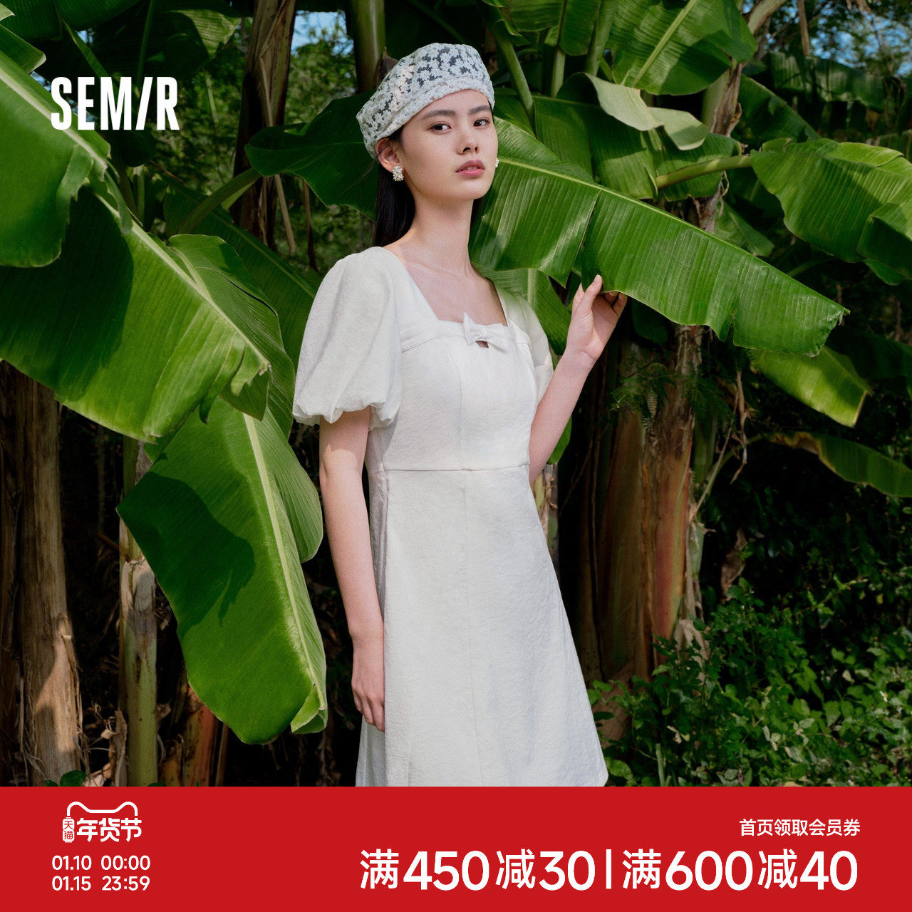 森马连衣裙女俏皮泡泡袖甜美优雅2023夏季新款蝴蝶结肌理短裙韩版