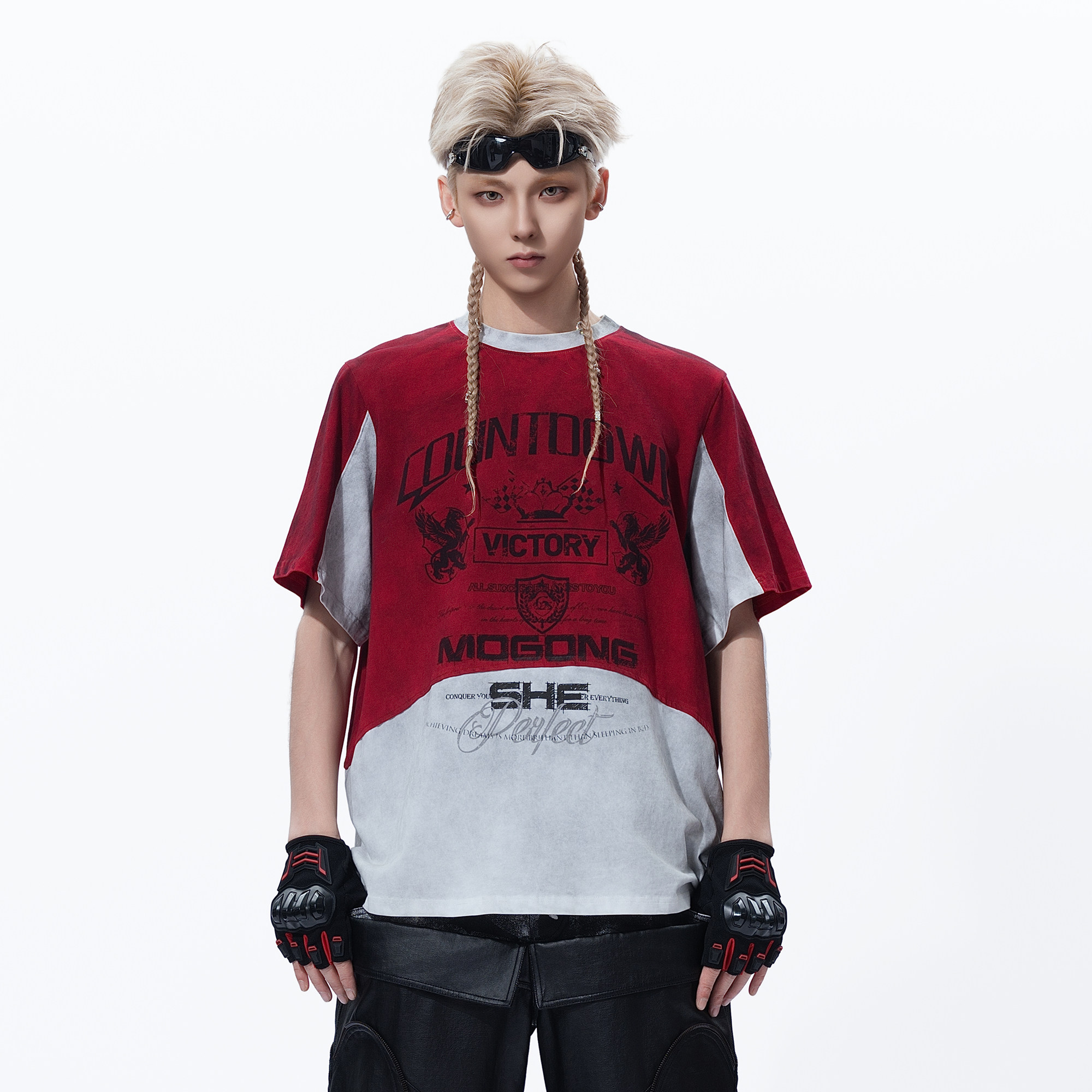 【明星同款】MOGONGSHE赛车元素宽松上衣水洗做旧短袖t恤撞色拼接