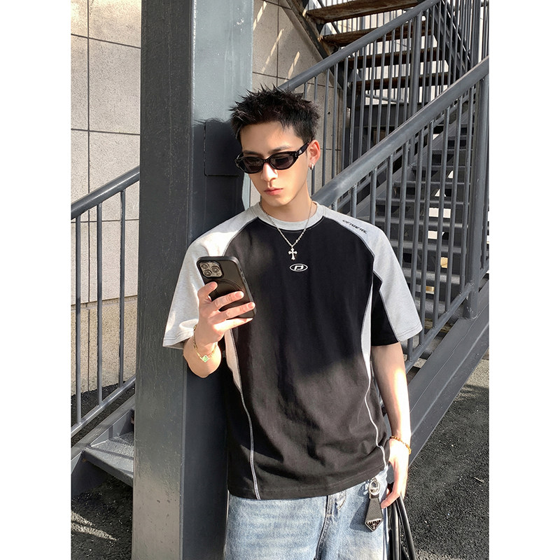 PLTH*复古赛车风插肩撞色T恤夏季明线设计感宽松短袖潮牌运动上衣