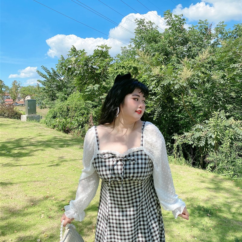 出短袖啦~胖mm遇见大码女装雪纺格子200斤大码连衣裙中长款韩版