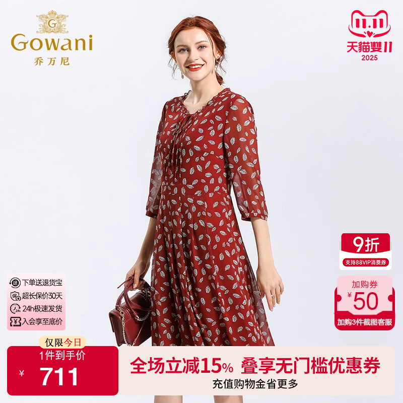 乔万尼商场秋装新款女韩版修身七分袖羽毛印花雪纺连衣裙女中长款