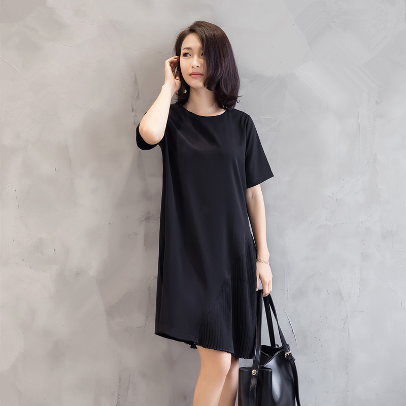 韩版春夏前后拼接雪纺气质时尚连衣裙开叉中长款黑色短袖T恤裙女