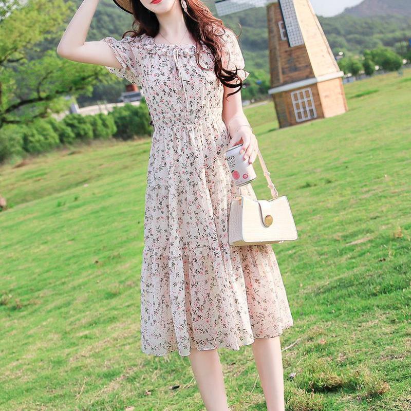 2024夏装新款收腰显瘦碎花雪纺连衣裙女夏中长款裙子仙女气质优雅