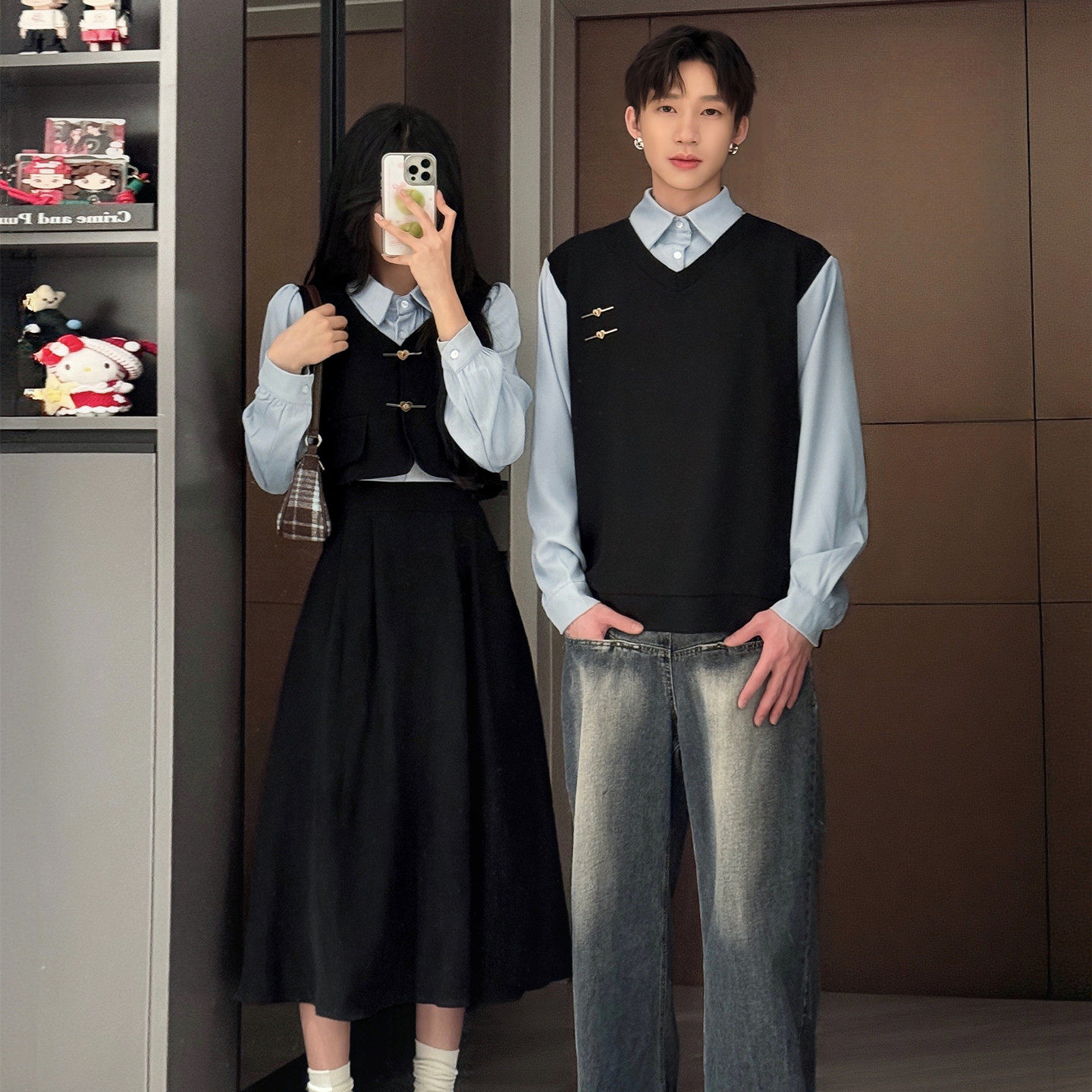 2025新款秋季情侣装一裙一衣法式设计感拼接连衣裙学院风显瘦长袖