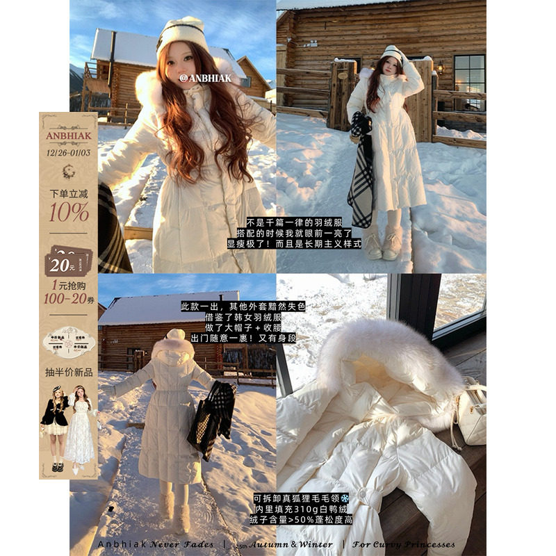安妮不火高克重狐狸毛毛领连帽毛球羽绒服女微胖大码长款羽绒外套