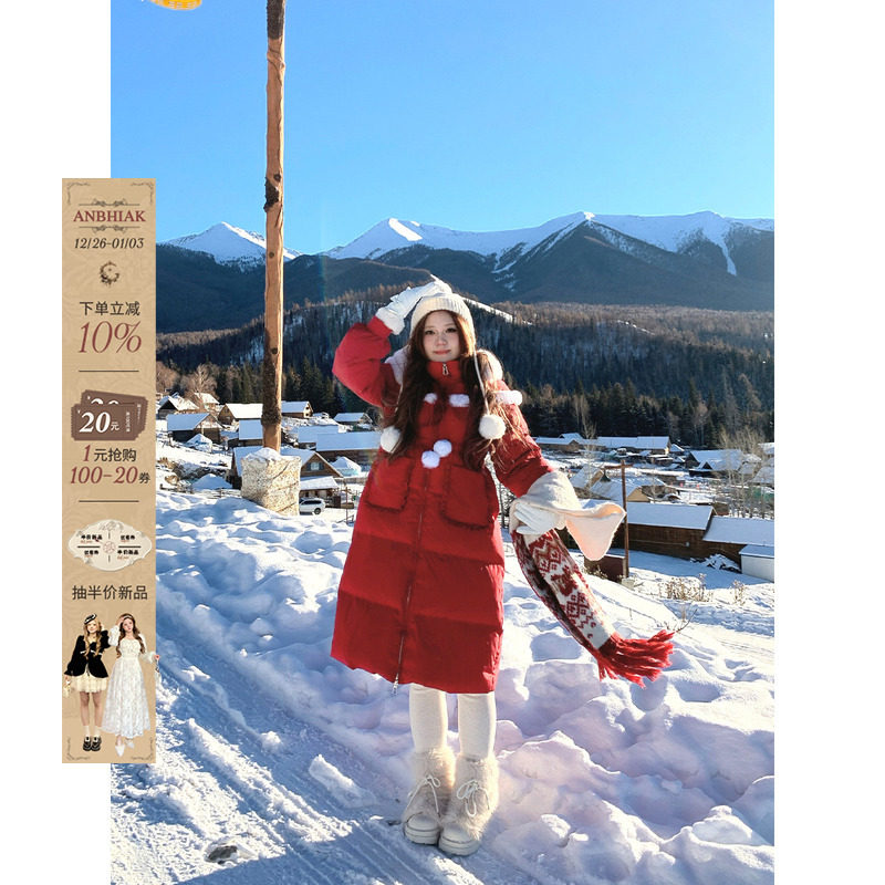 DM100大码百分百女装微胖mm冬季大毛领红色长款加厚羽绒服外套
