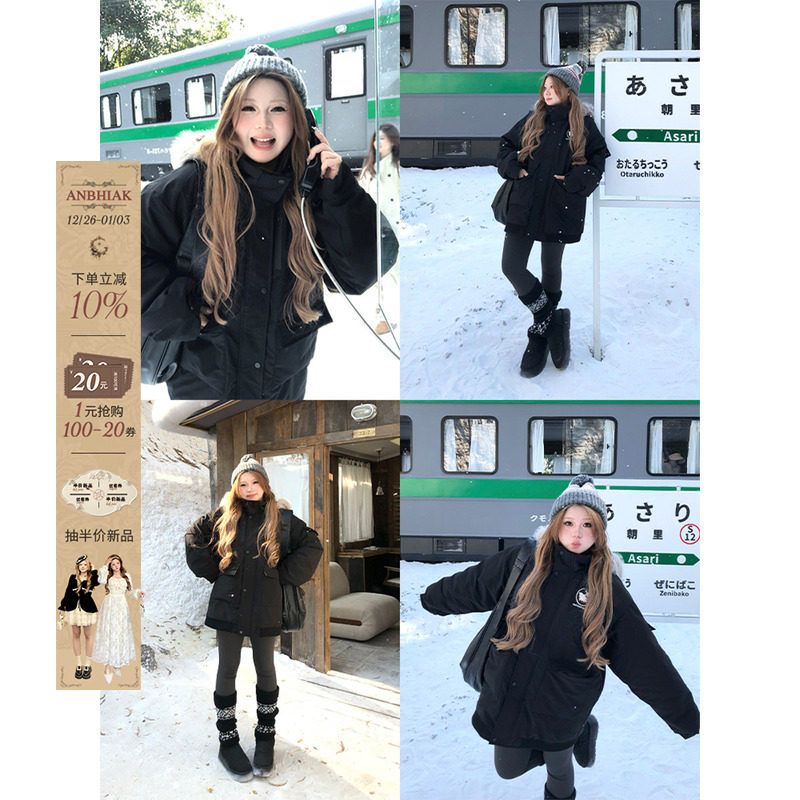 安妮不火 宽松毛领连帽立领防风羽绒服女微胖大码冲锋衣羽绒外套