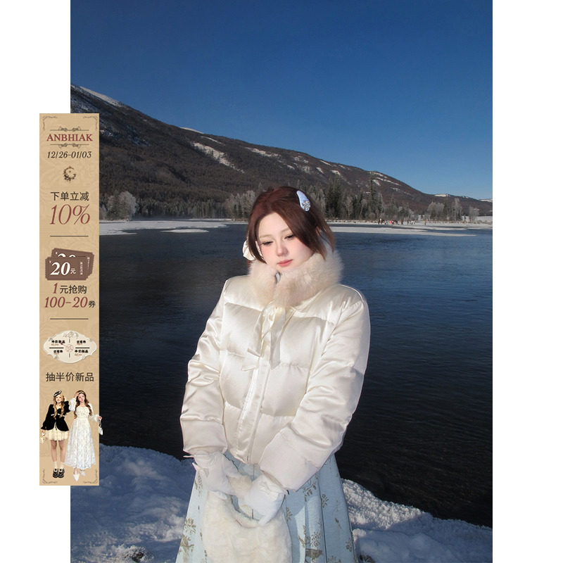 安妮不火富家千金加厚保暖缎面毛领羽绒服女微胖大码短款羽绒外套