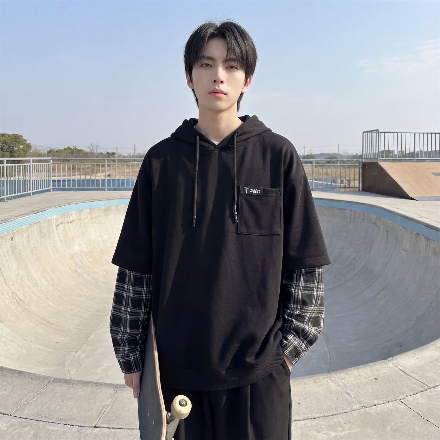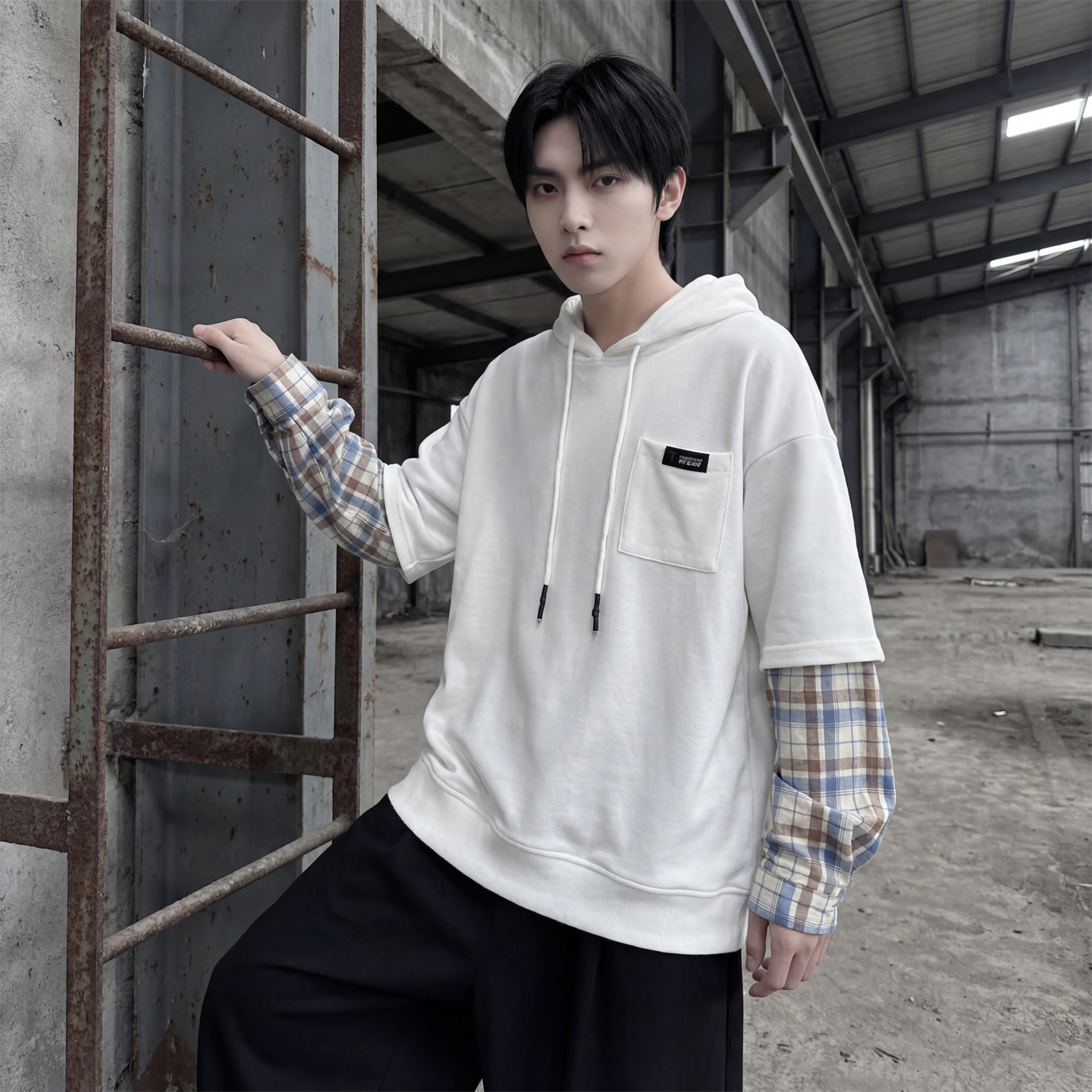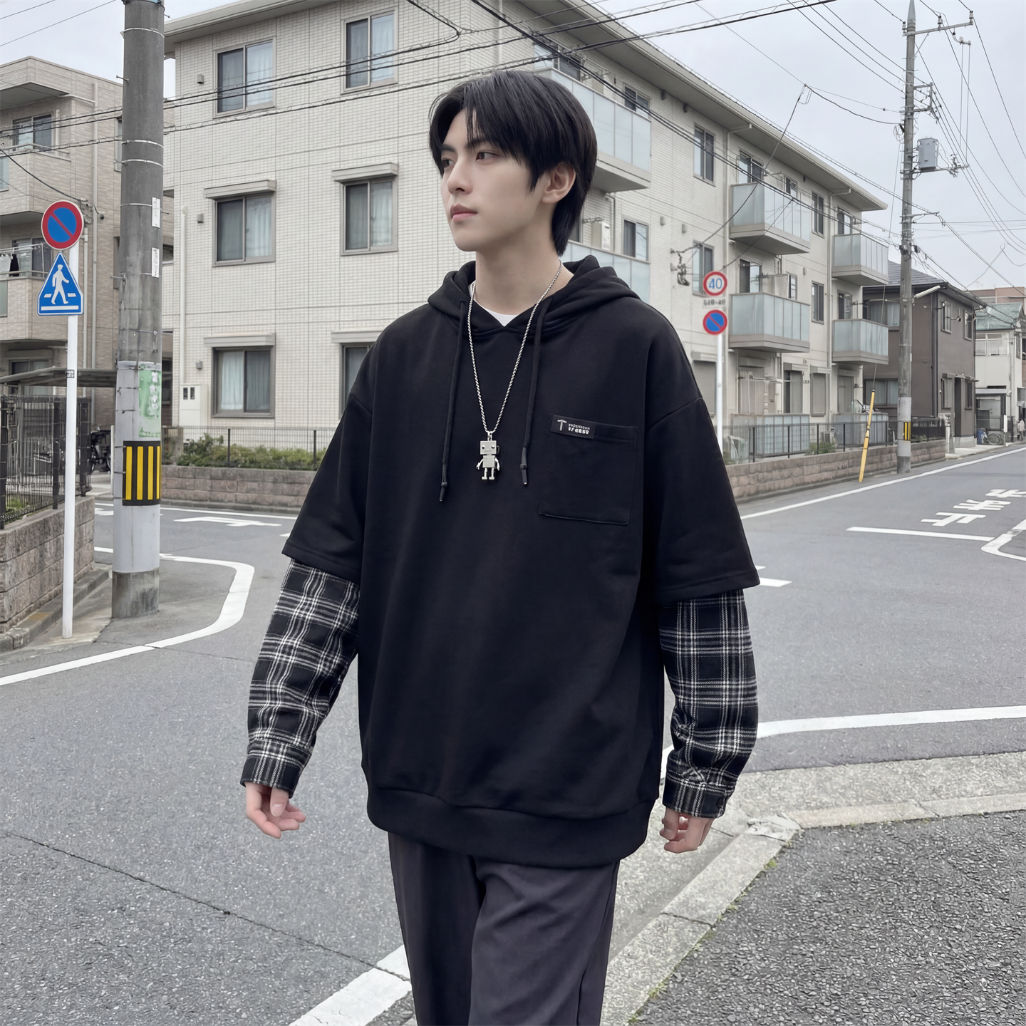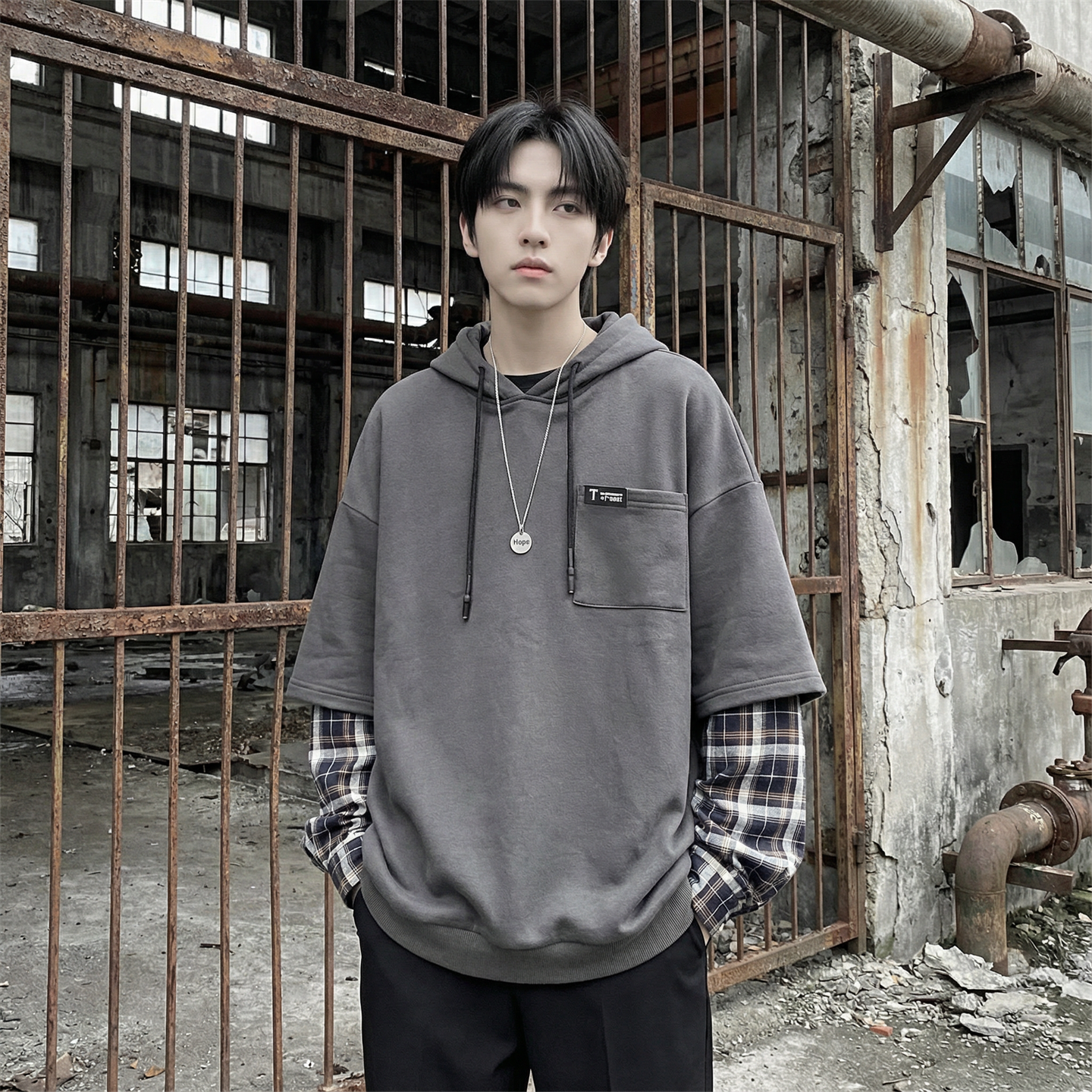 现货 春季连帽卫衣男潮牌ins假两件拼接格子慵懒风 W8212-P68