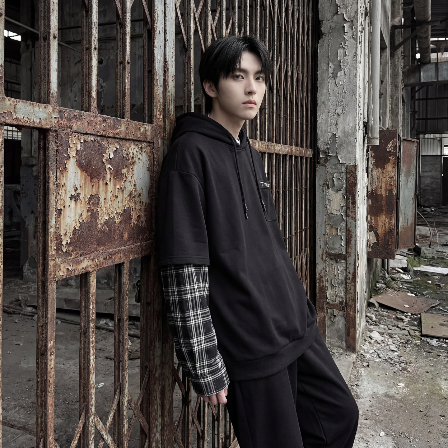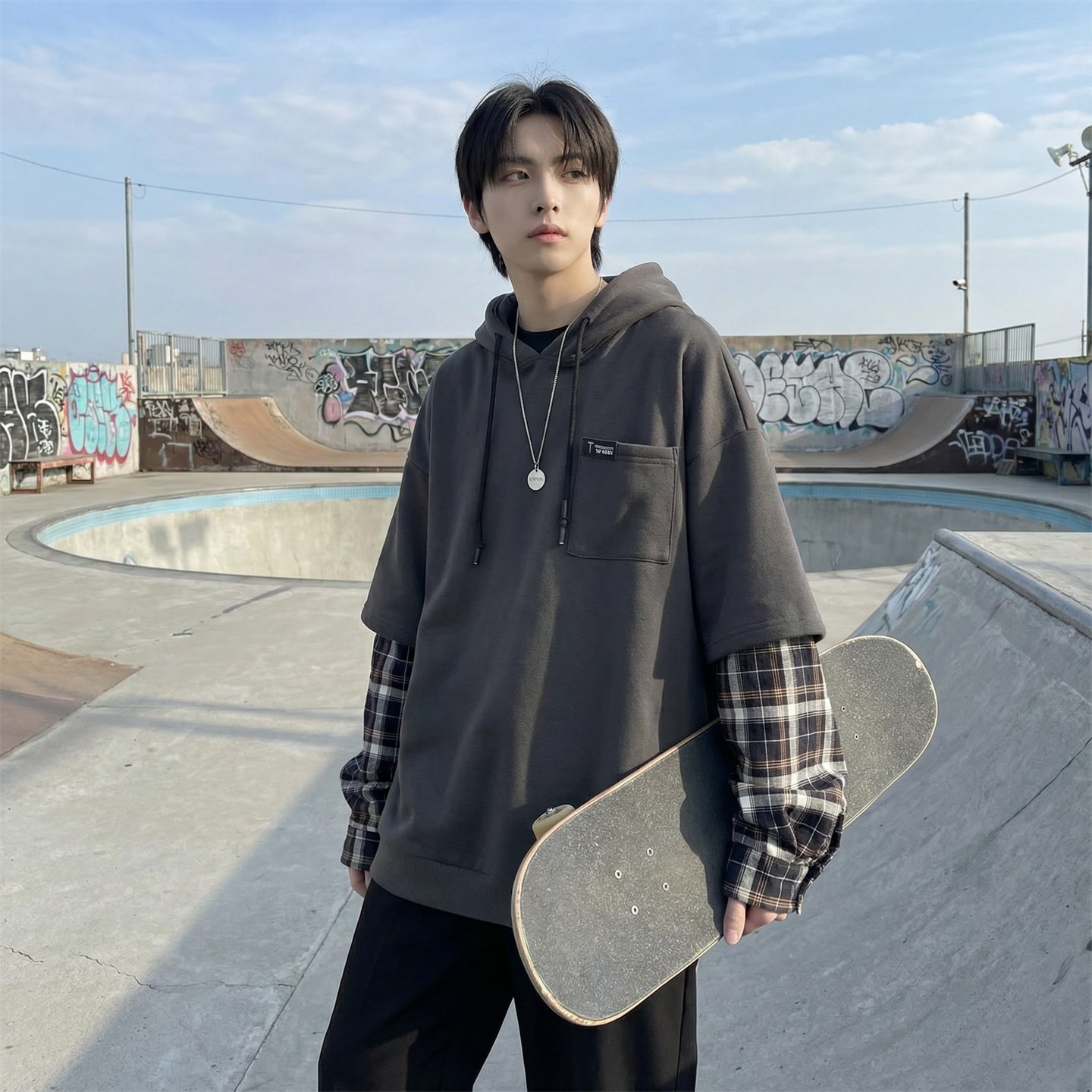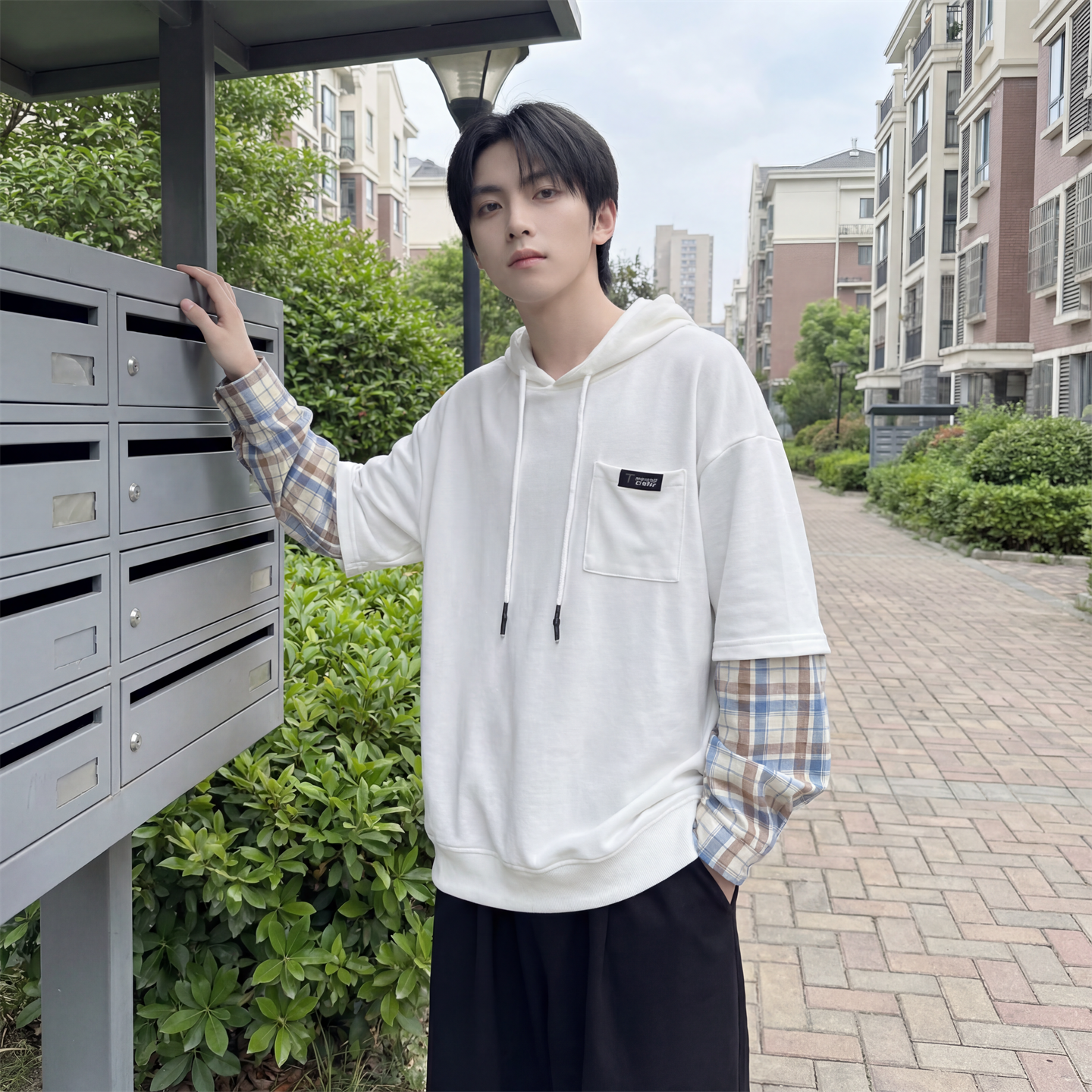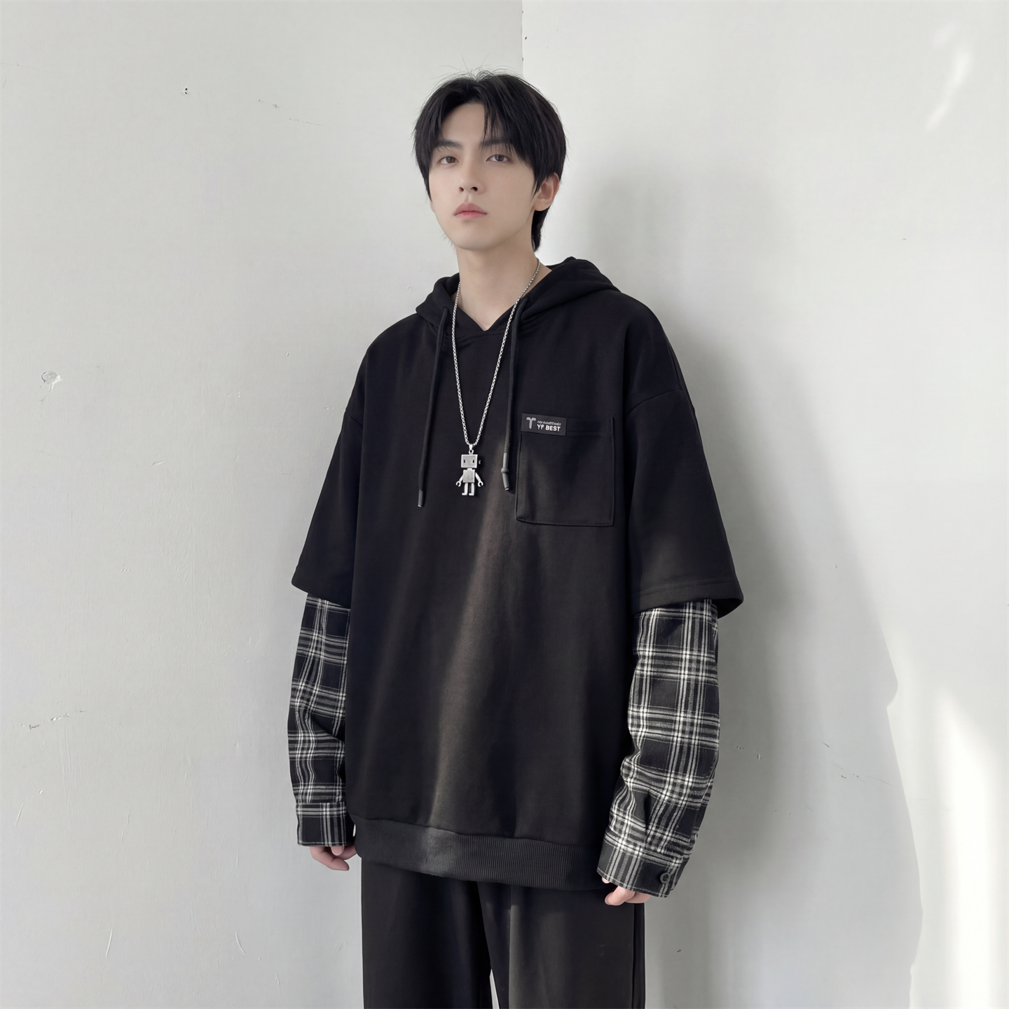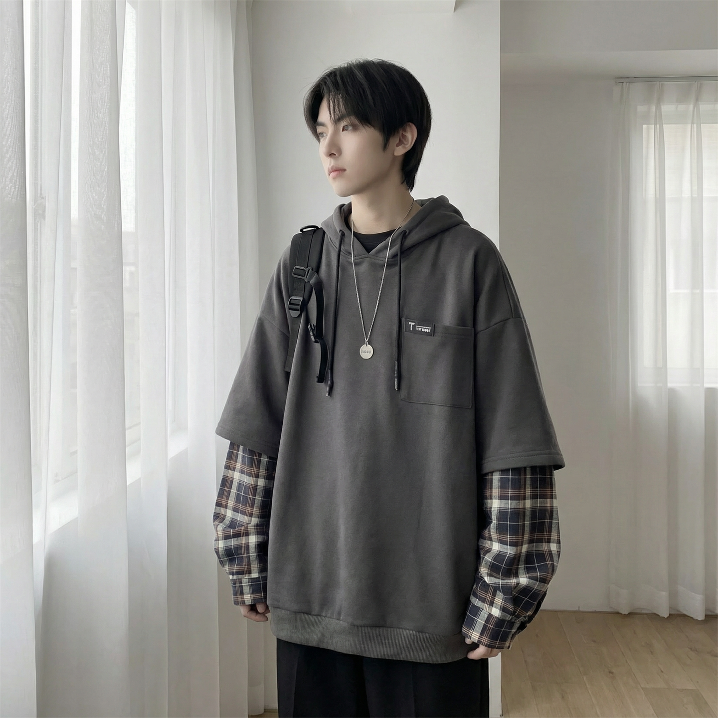 现货 春季连帽卫衣男潮牌ins假两件拼接格子慵懒风 W8212-P68