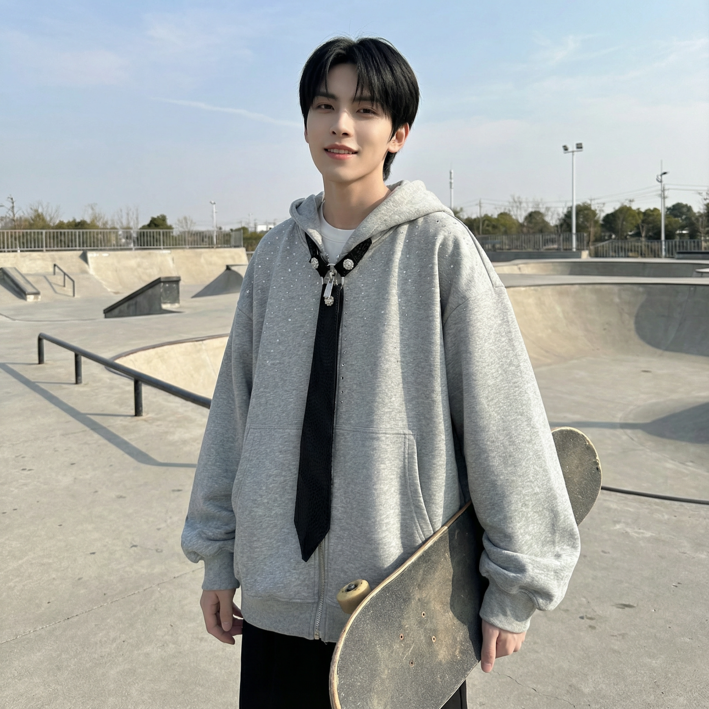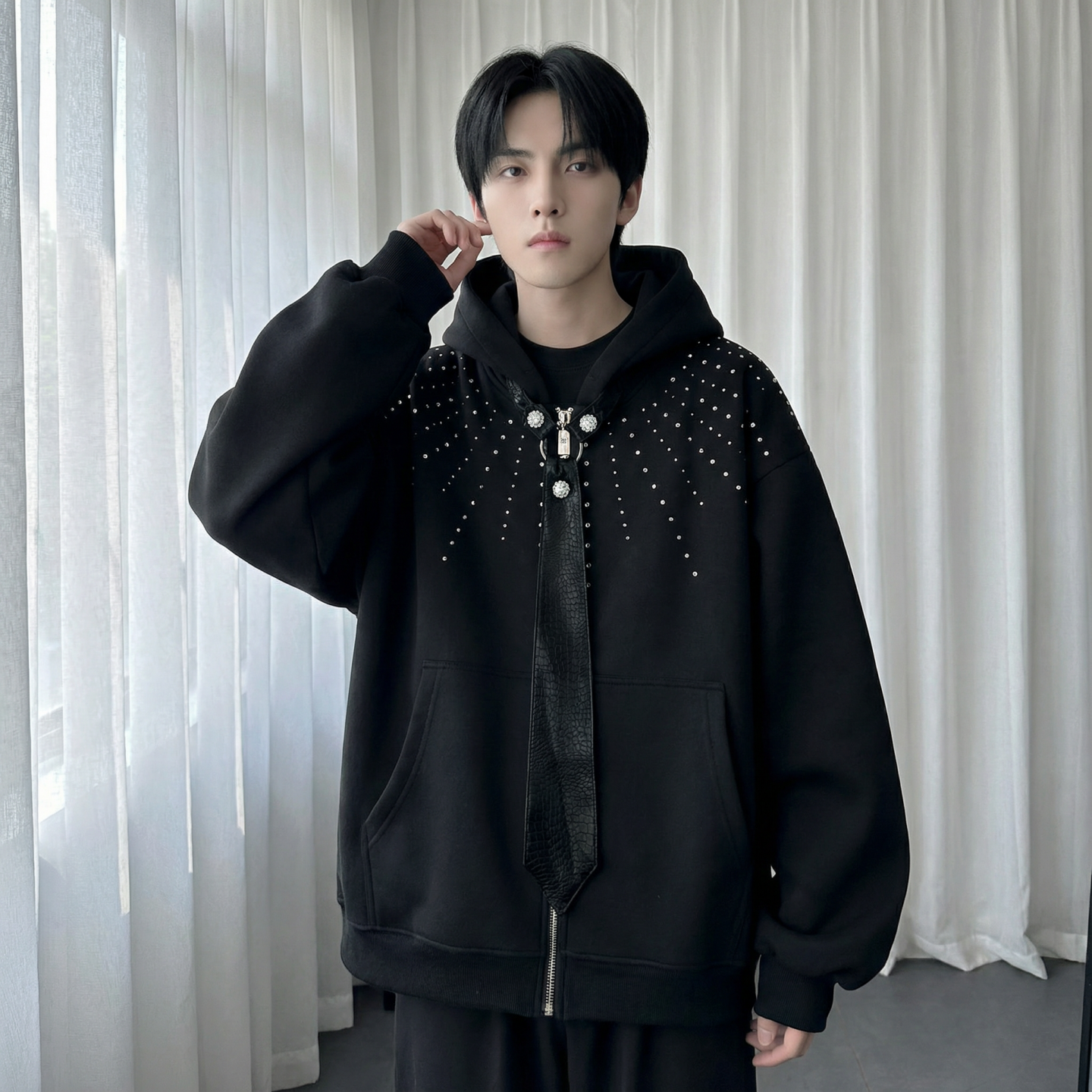 现货小众烫钻可拆卸领带设计连帽卫衣重磅宽松慵懒外套 W2056-P89