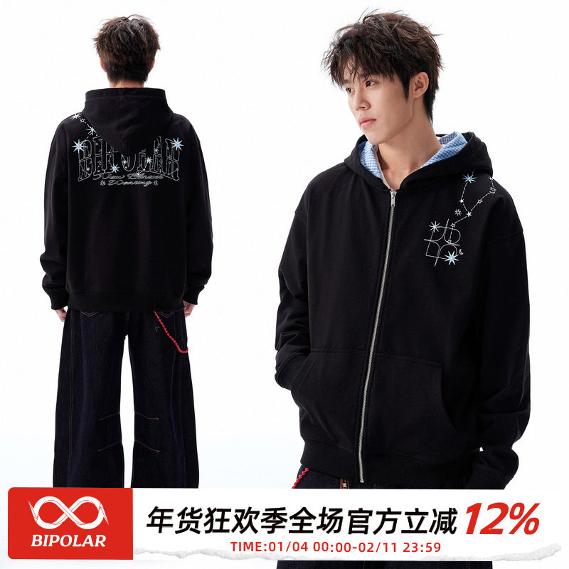 BIPOLAR星座珍珠刺绣连帽卫衣美式休闲开衫长袖上衣外套情侣新款