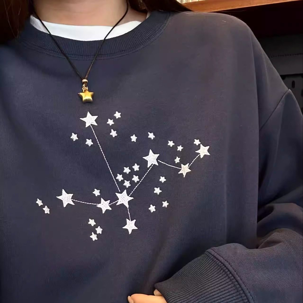 星座系刺绣款韩版简约卡通休闲宽松复古通勤学院圆领棉质卫衣情侣