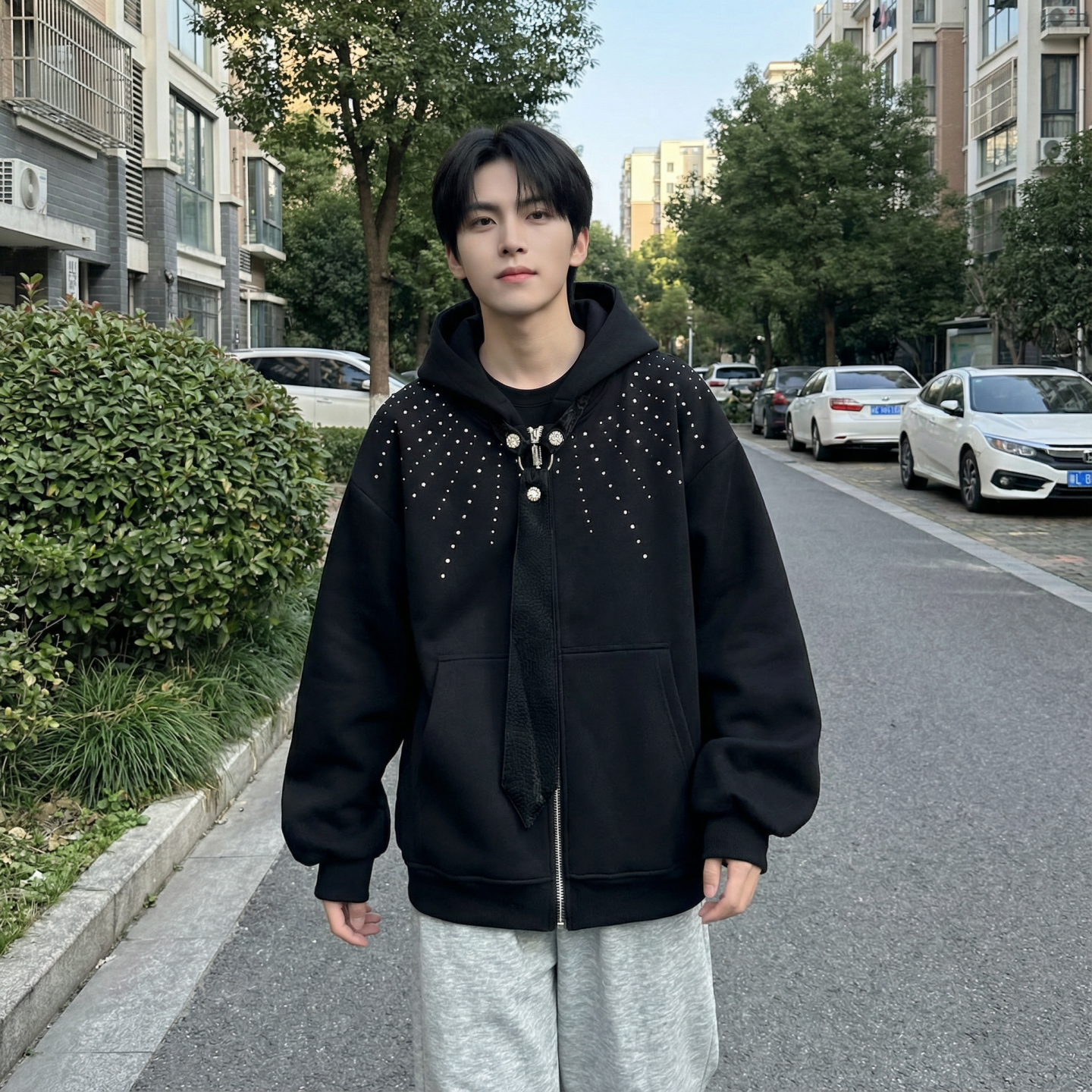 现货烫钻可拆卸领带设计连帽卫衣重磅细闪宽松慵懒外套 W2056-P89