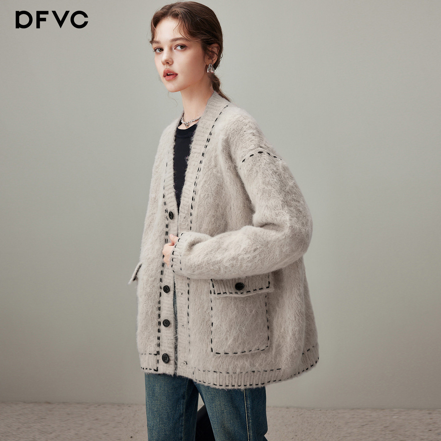dfvc灰色慵懒风羊毛中长款针织外套女2026年春季新款宽松开衫毛衣