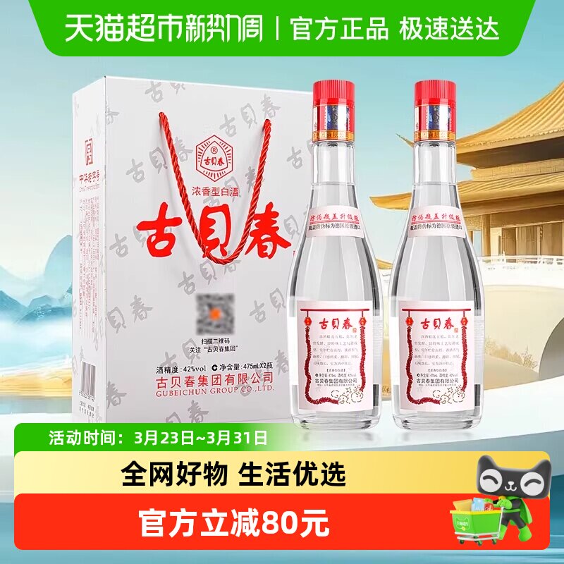 古贝春42度白板浓香型纯粮白酒固态法高端礼品商务475mL 2瓶装