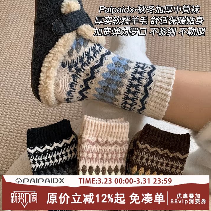 猫人费尔岛羊毛袜子女款冬季加绒加厚保暖中筒袜女士复古长筒棉袜
