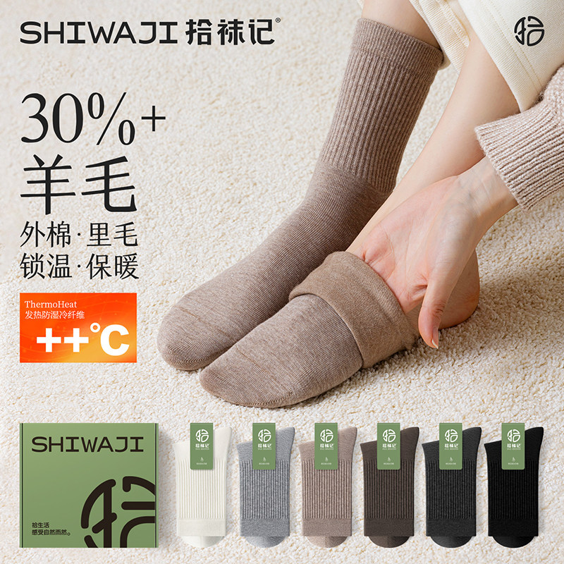 拾袜记羊毛袜子女美利奴中筒袜冬季保暖加绒加厚防臭情侣长棉袜男