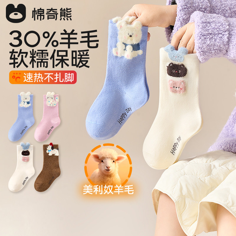 儿童羊毛袜子女童秋冬保暖绵羊毛中筒棉袜女孩冬季加绒加厚无骨袜