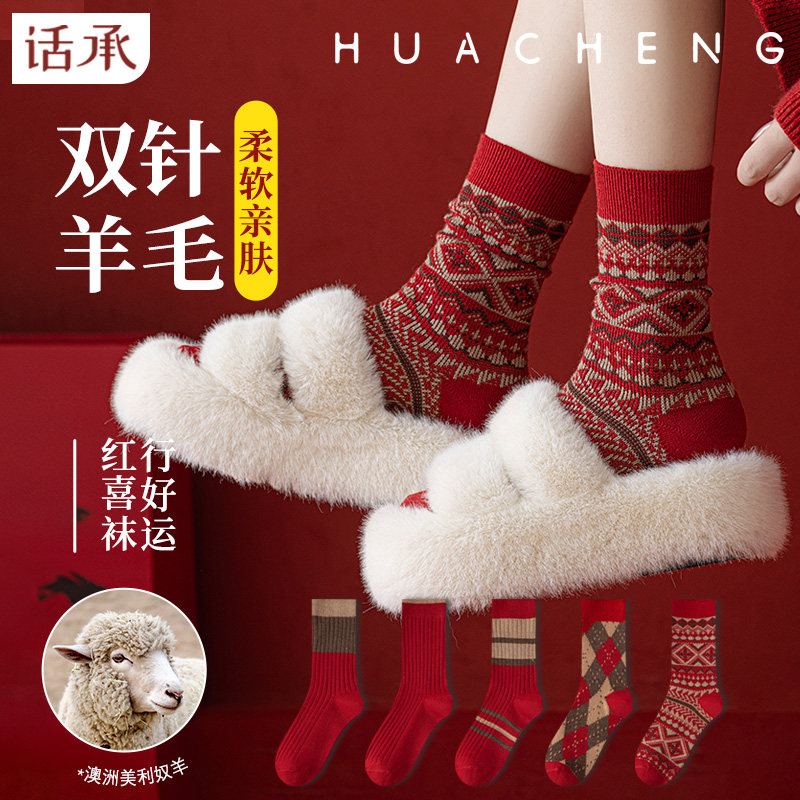 本命年红色袜子女秋冬季中筒袜马年2026新年羊毛袜无骨棉袜礼盒装